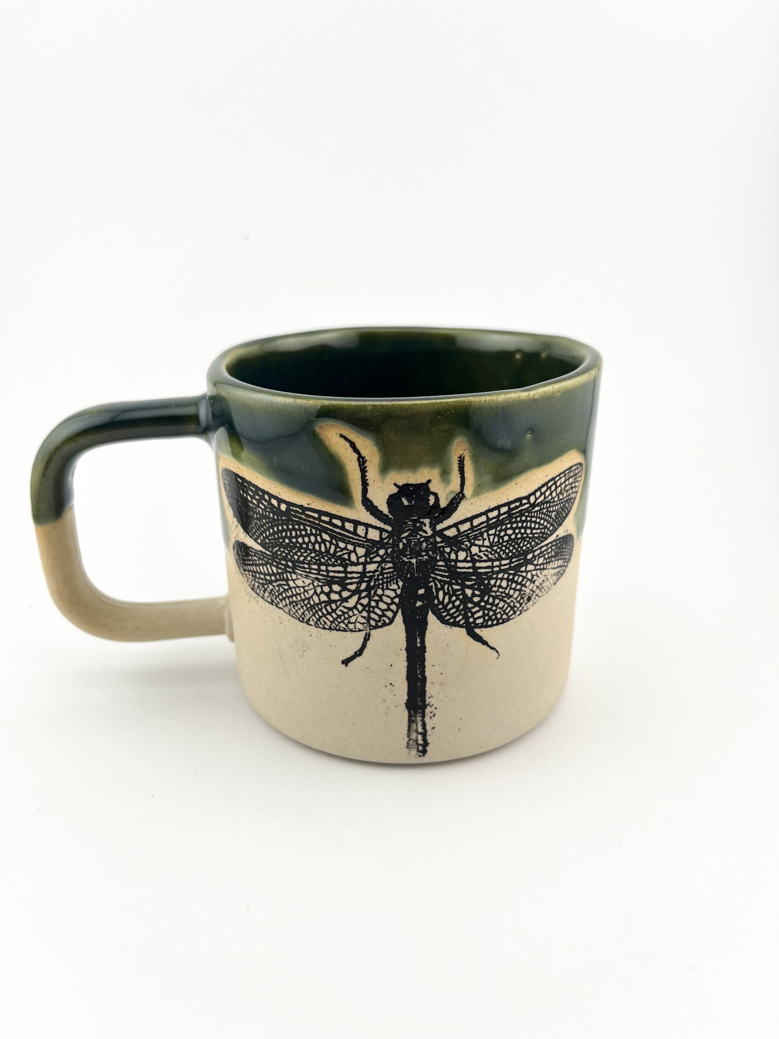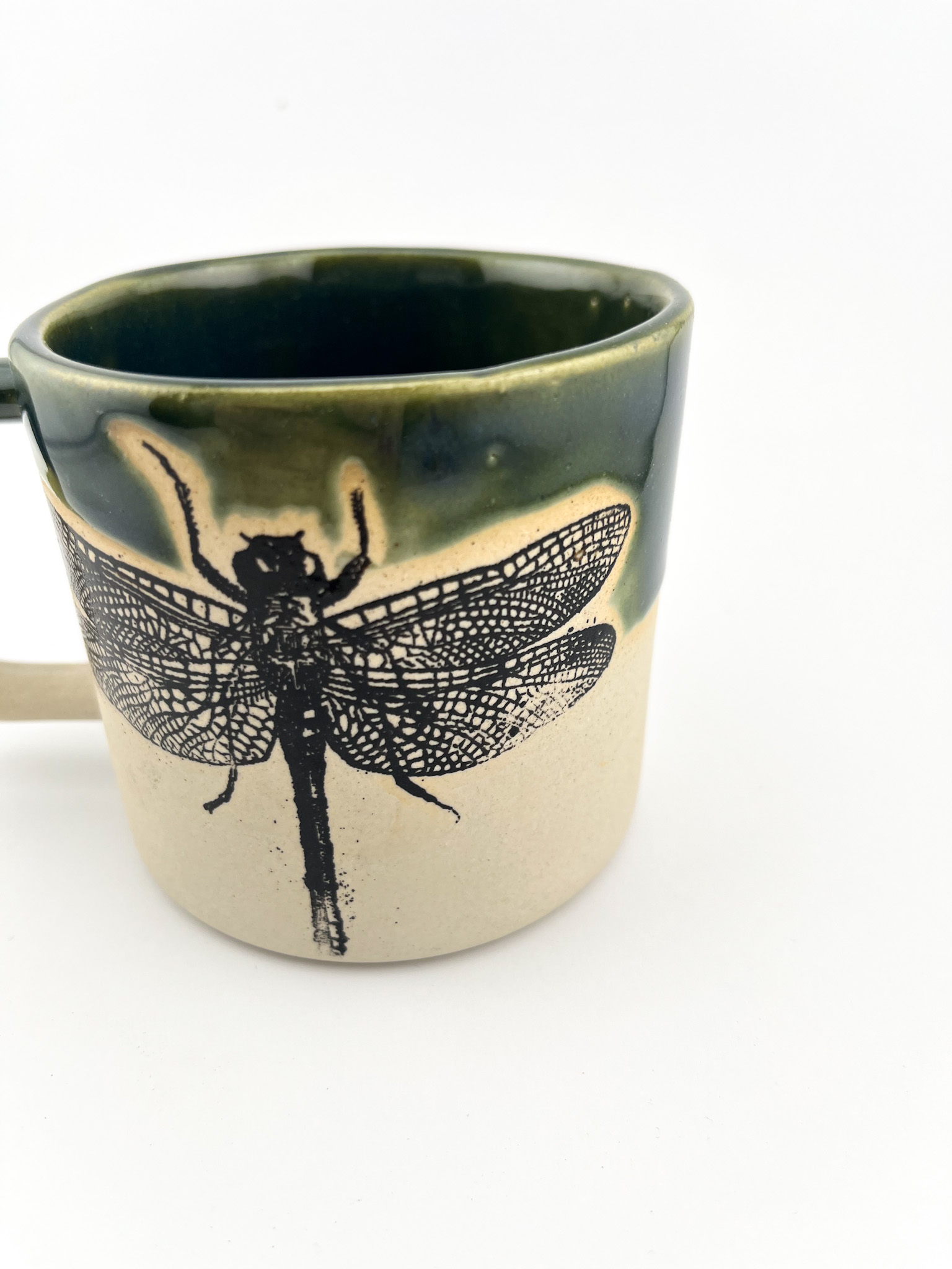Odkryj magię detalu z naszym ręcznie wykonanym kubkiem z motywem ważki. To naczynie, które wprowadza spokój i harmonię do codziennych rytuałów, łącząc surowość naturalnej gliny z głęboką, leśną zielenią szkliwa.