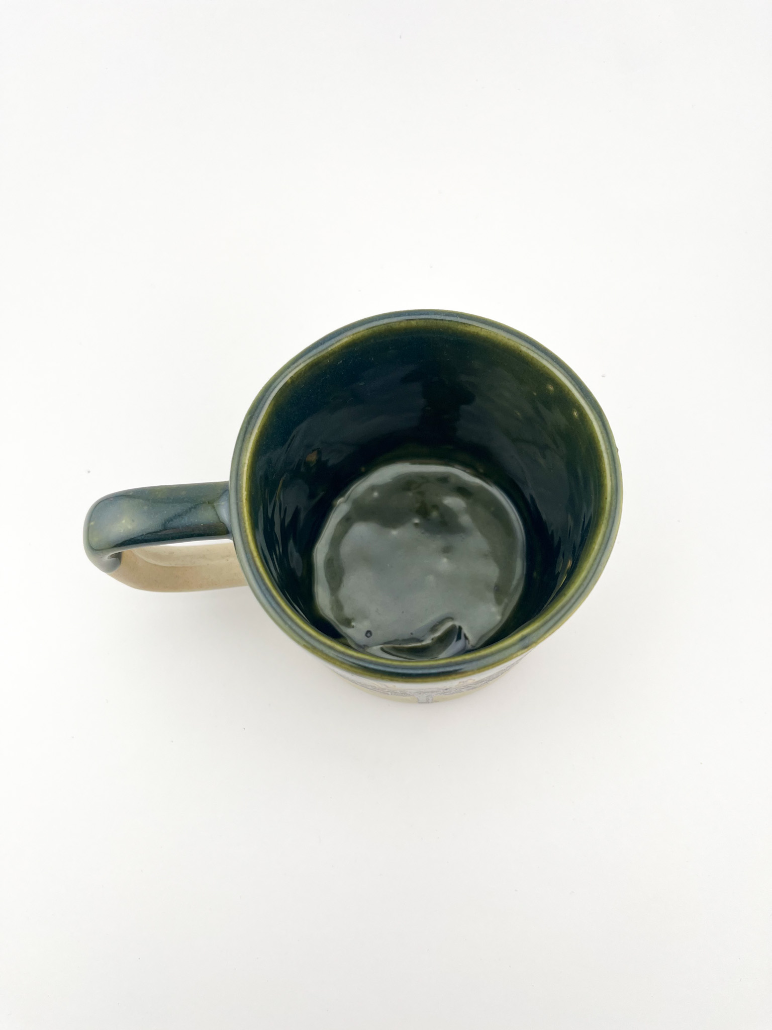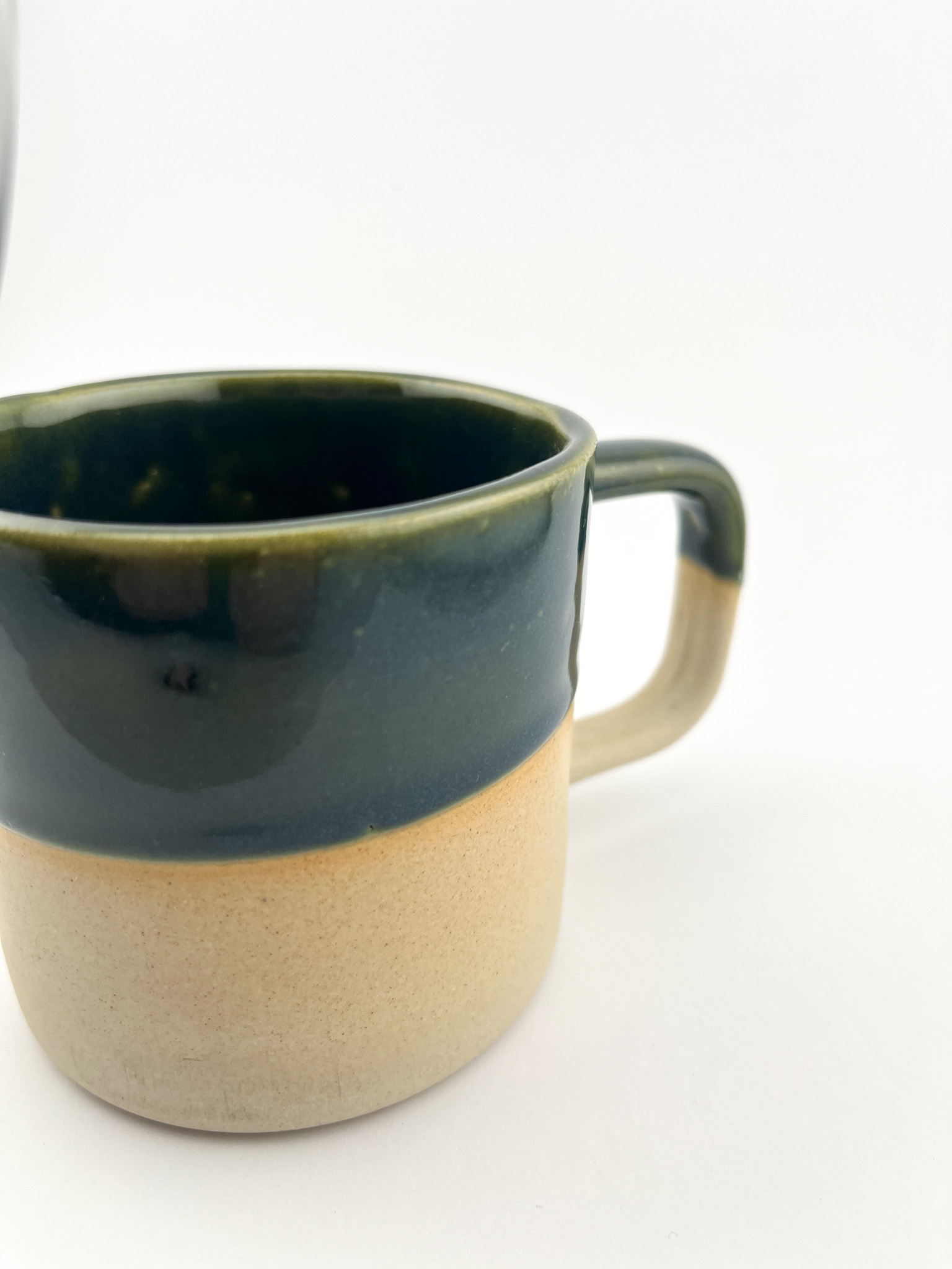 • Głęboka Zieleń Szkliwa: Górna krawędź oraz wnętrze kubka pokryte są lśniącym szkliwem w kolorze butelkowej zieleni. Efektowne, ręczne zacieki na styku z jasną gliną nadają mu unikalny, rzemieślniczy sznyt.