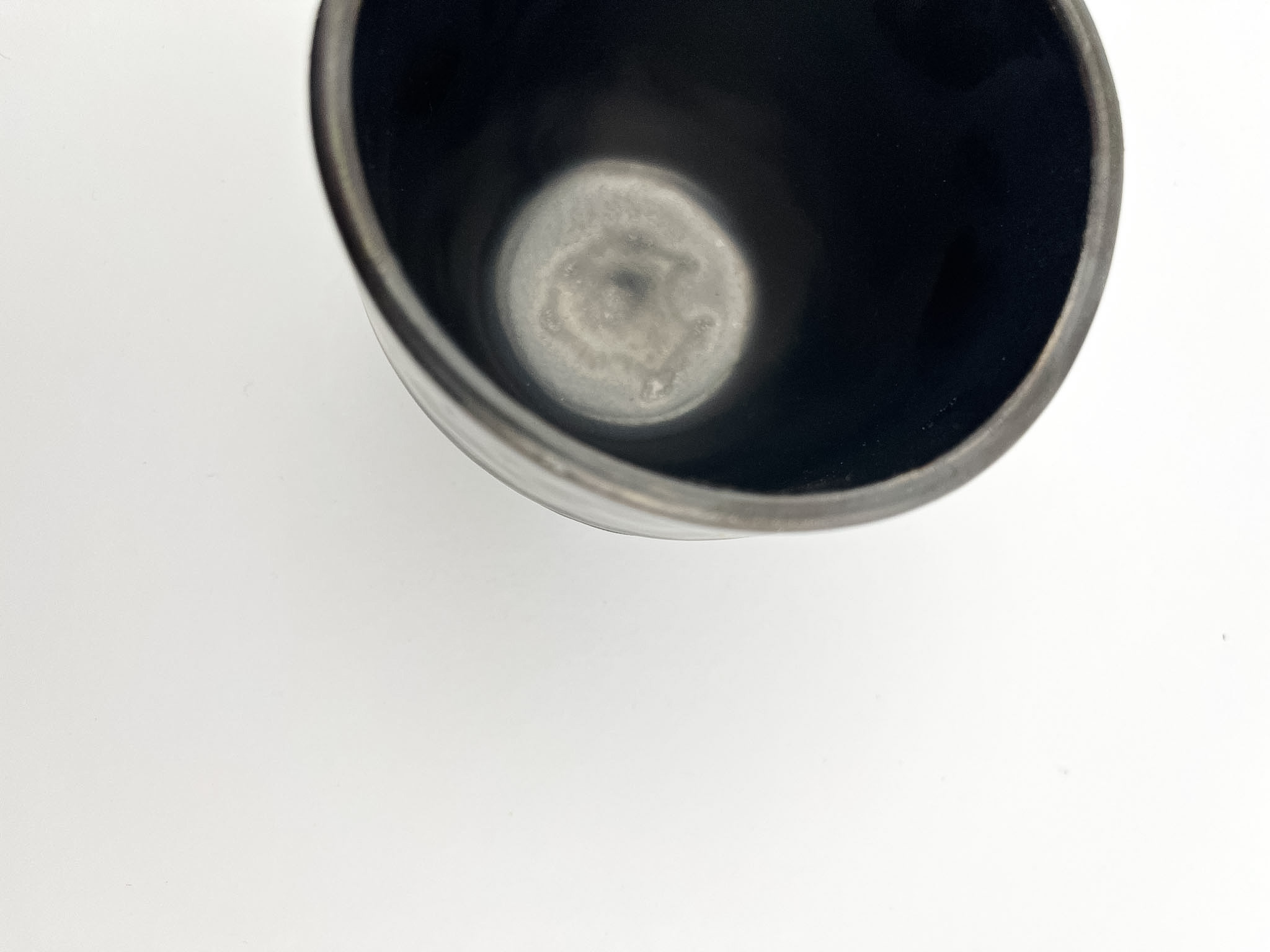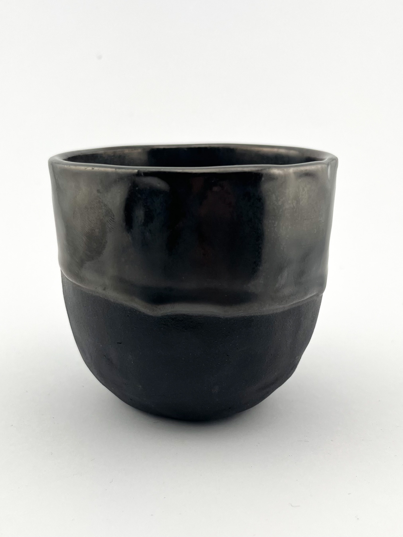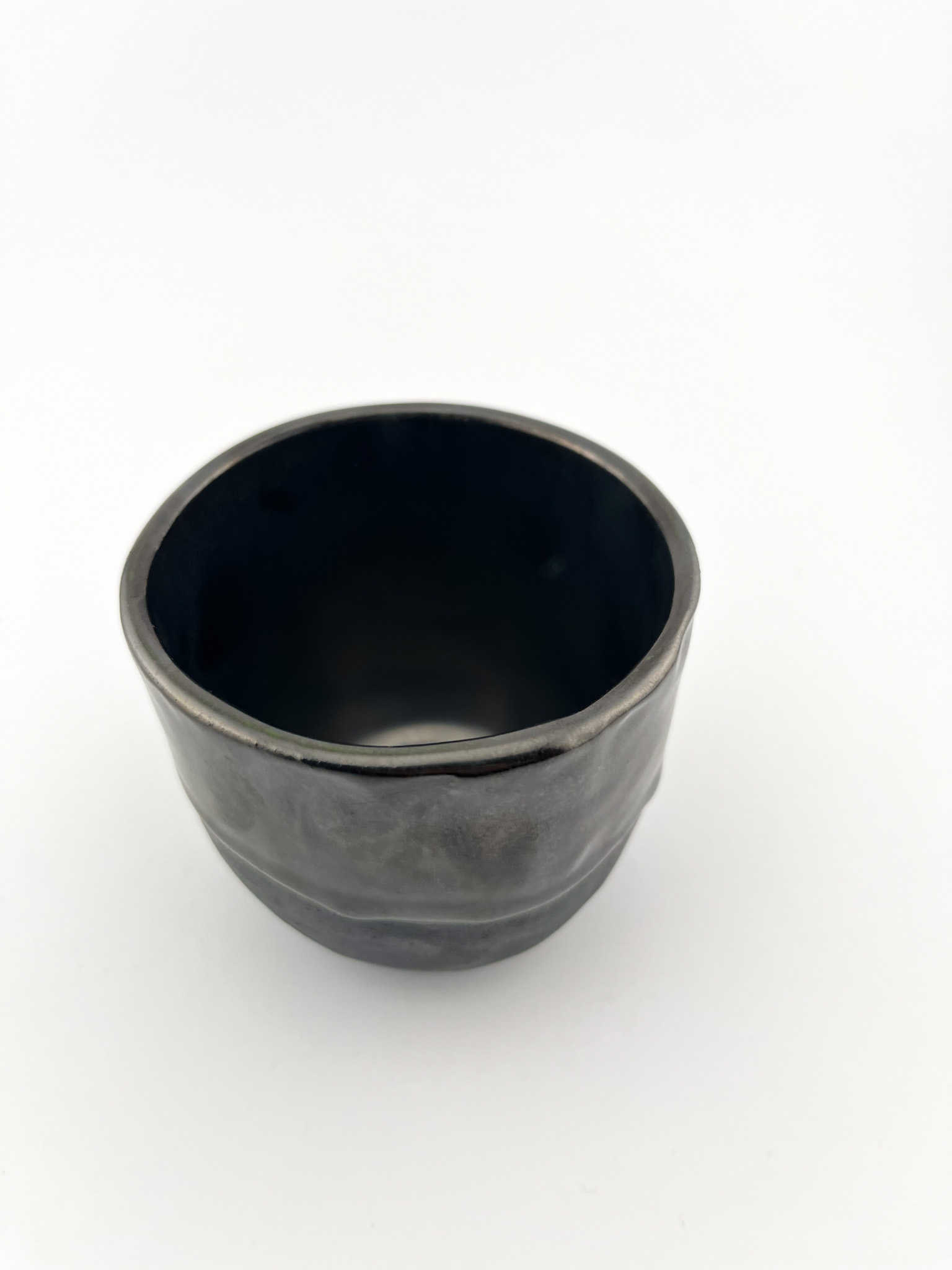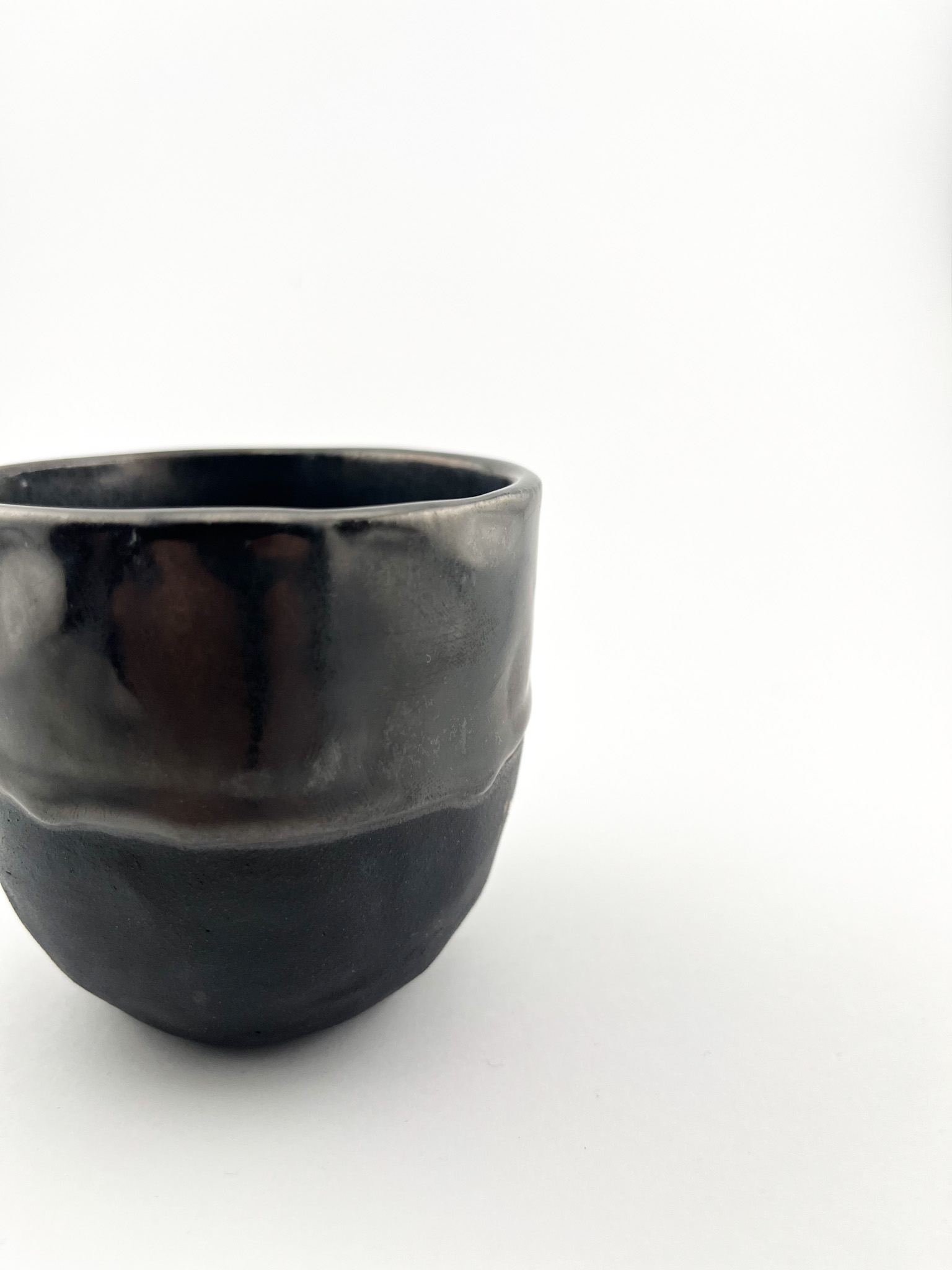 Czarka uformowana z czarnej gliny, surowa i głęboka w wyrazie, szkliwiona do połowy w odcieniu metalicznym.. Kontrast między matową fakturą nieszkliwionej powierzchni a lśniącym szkliwem tworzy wyrafinowaną grę światła i struktury.
