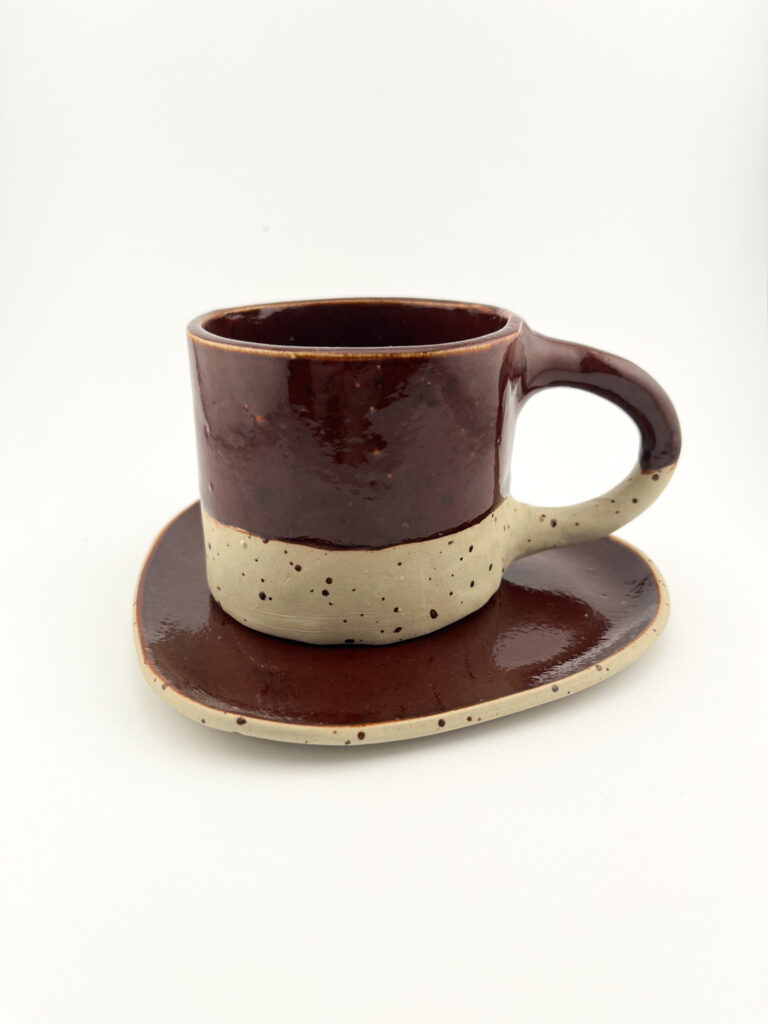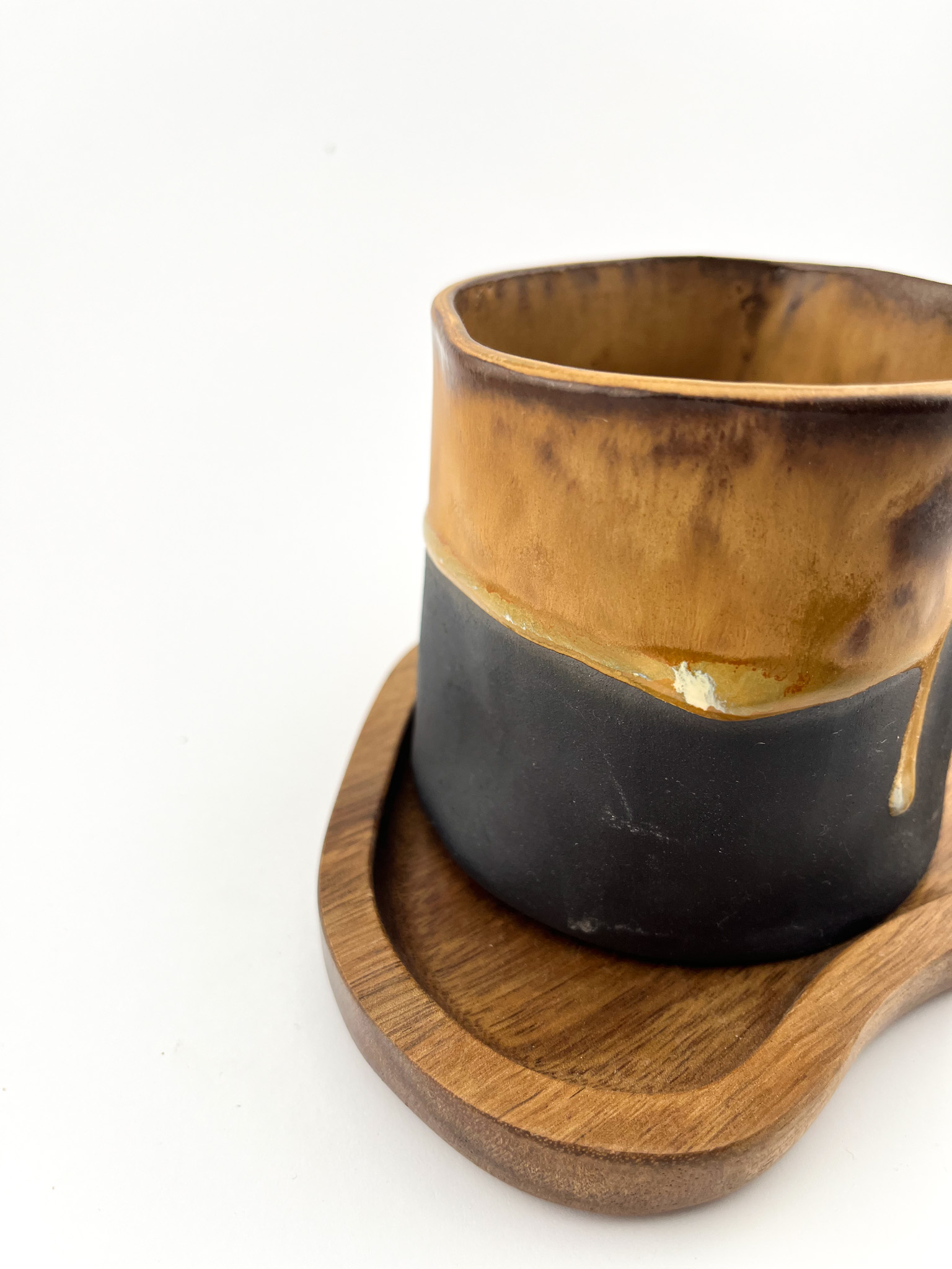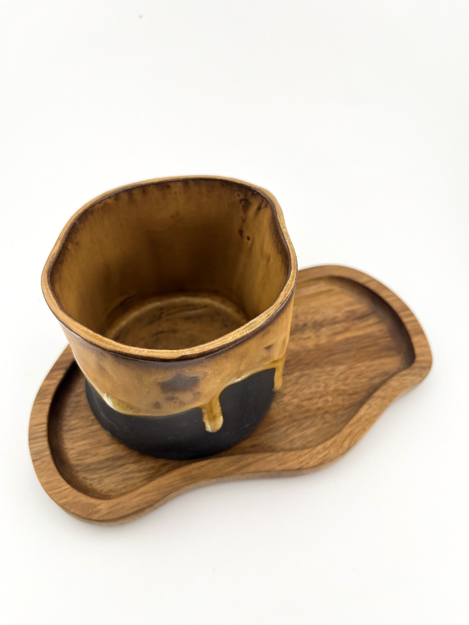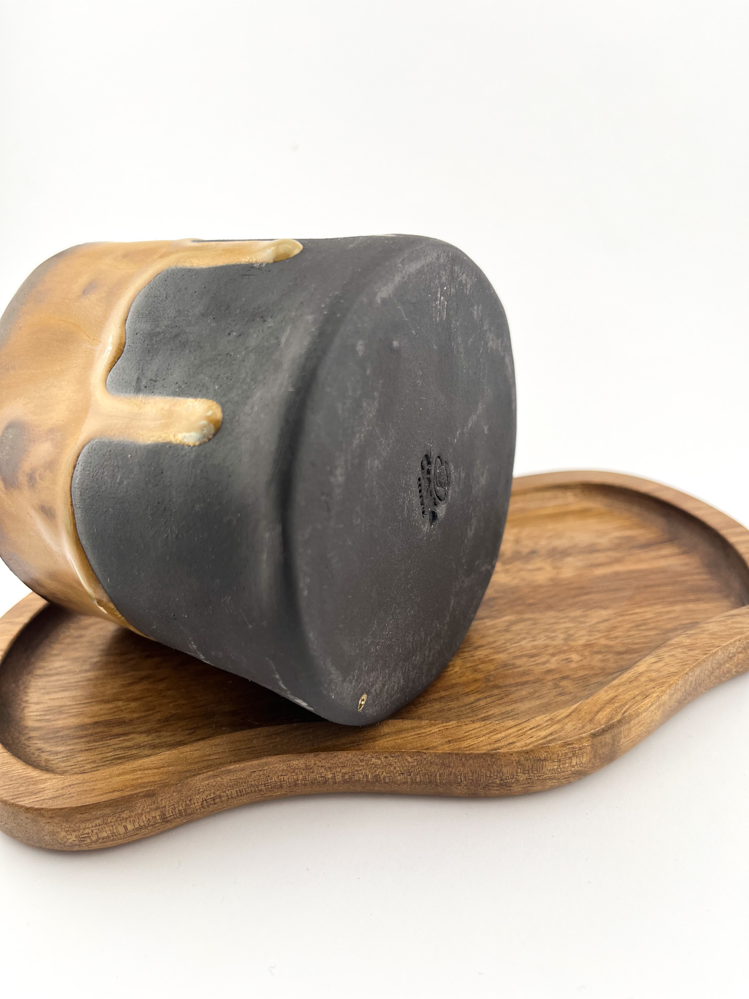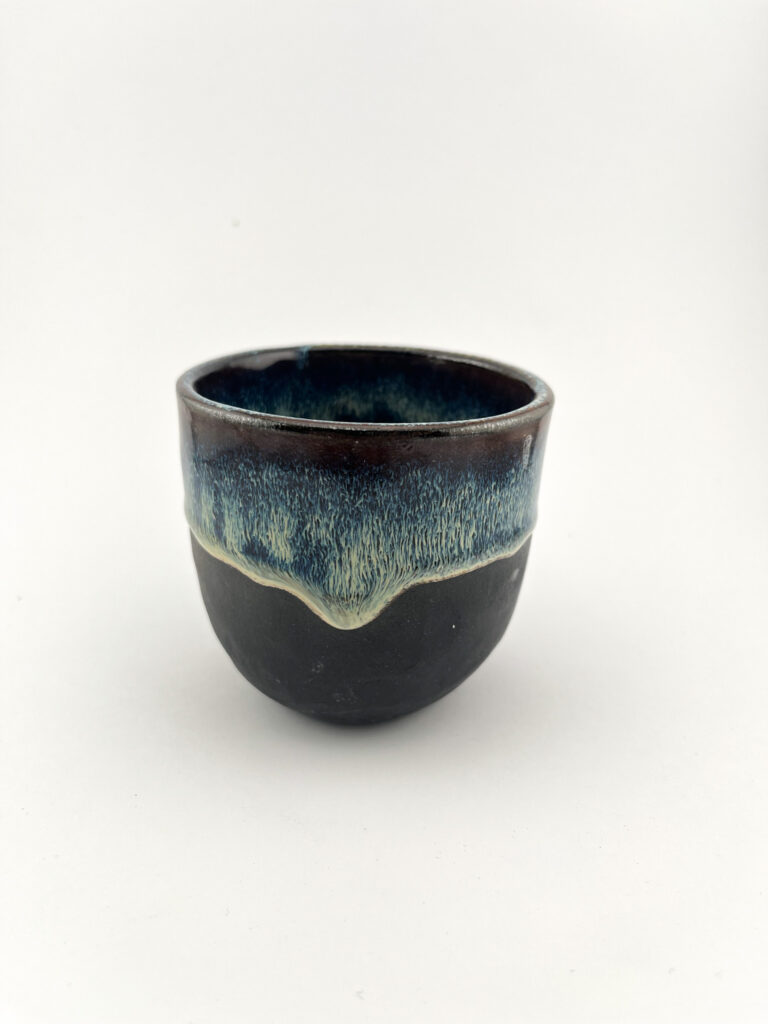 • Kontrastowe Szkliwienie: Głęboka, matowa czerń dolnej części naczynia spotyka się z ciepłym, miodowo-brązowym szkliwem u góry. Efektowne, ręczne zacieki sprawiają, że każde naczynie ma swój indywidualny charakter.